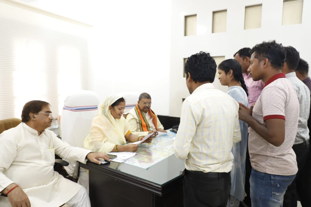 रायपुर। भारतीय जनता पार्टी के कुशाभाऊ ठाकरे परिसर स्थित प्रदेश कार्यालय में प्रदेश की महिला व बाल विकास मंत्री लक्ष्मी राजवाड़े ने गुरुवार को कार्यकर्ताओं से मुलाकात कर उनकी समस्याएँ सुनीं एवं उनके समाधान हेतु संबंधित अधिकारियों को आवश्यक निर्देश दिए। गुरुवार को सहयोग केंद्र में मंत्री श्रीमती राजवाड़े से 150 से अधिक कार्यकर्ताओं व आमजनों ने मुलाकात कर आवेदन दिए। मंत्री श्रीमती राजवाड़े ने कार्यकर्ताओं को आश्वस्त किया कि सभी समस्याओं का तेजी से निराकरण किया जाएगा। इस अवसर पर भाजपा प्रदेश महामंत्री डॉ. नवीन मार्कण्डेय, प्रदेश कार्यालय मंत्री अशोक बजाज एवं सहयोग केन्द्र प्रभारी सचिदानंद उपासने सहित पदाधिकारीगण व कार्यकर्तागण उपस्थित रहे।